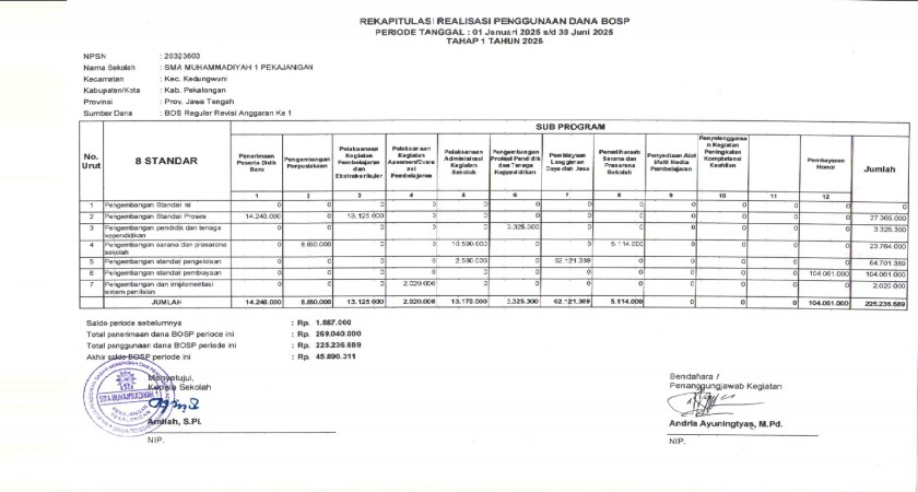 Berikut kami sampaikan laporan rekapitulasi realisasi BOSP Tahun Anggaran 2025 SMA Muhammadiyah 1 Pekajangan Kab. Pekalongan